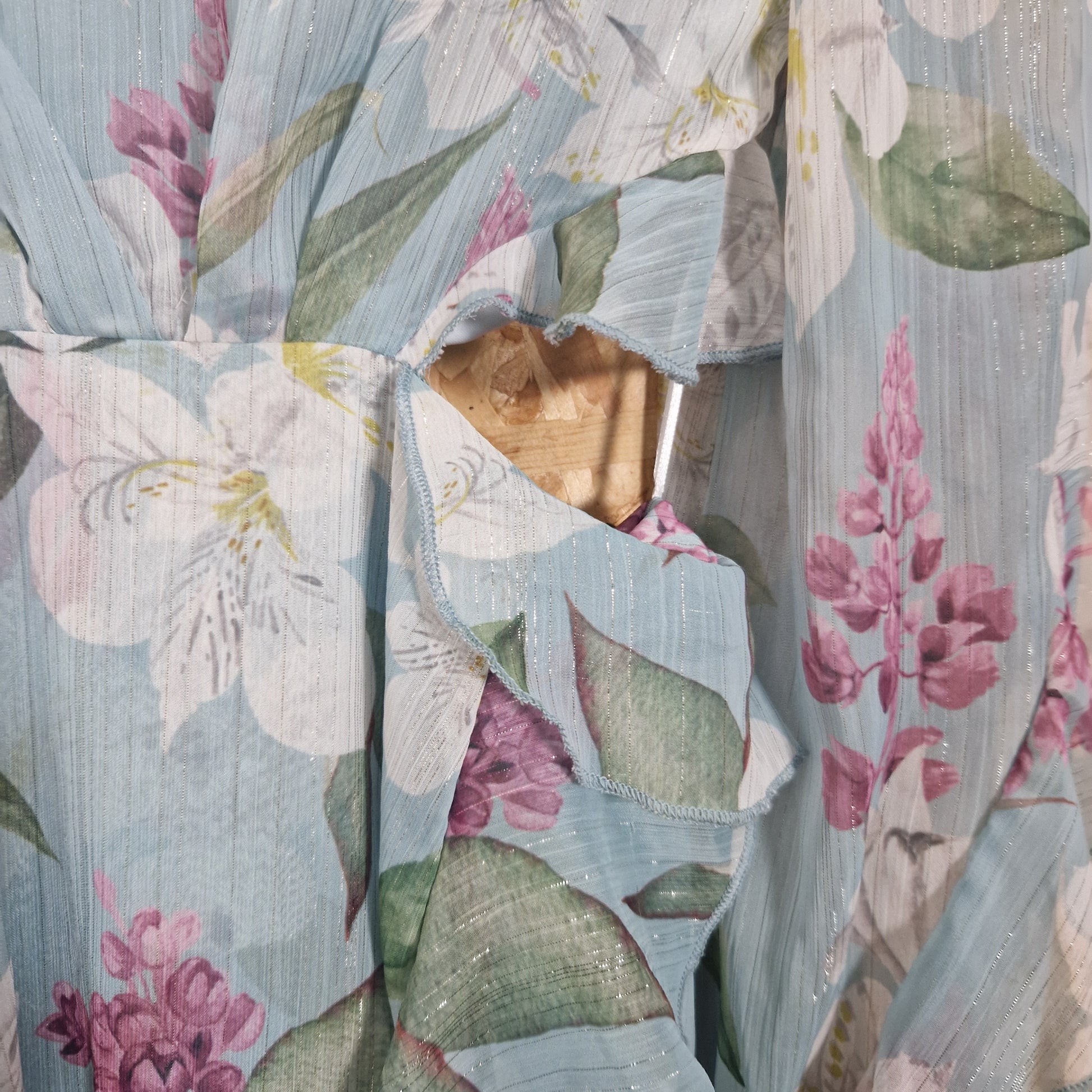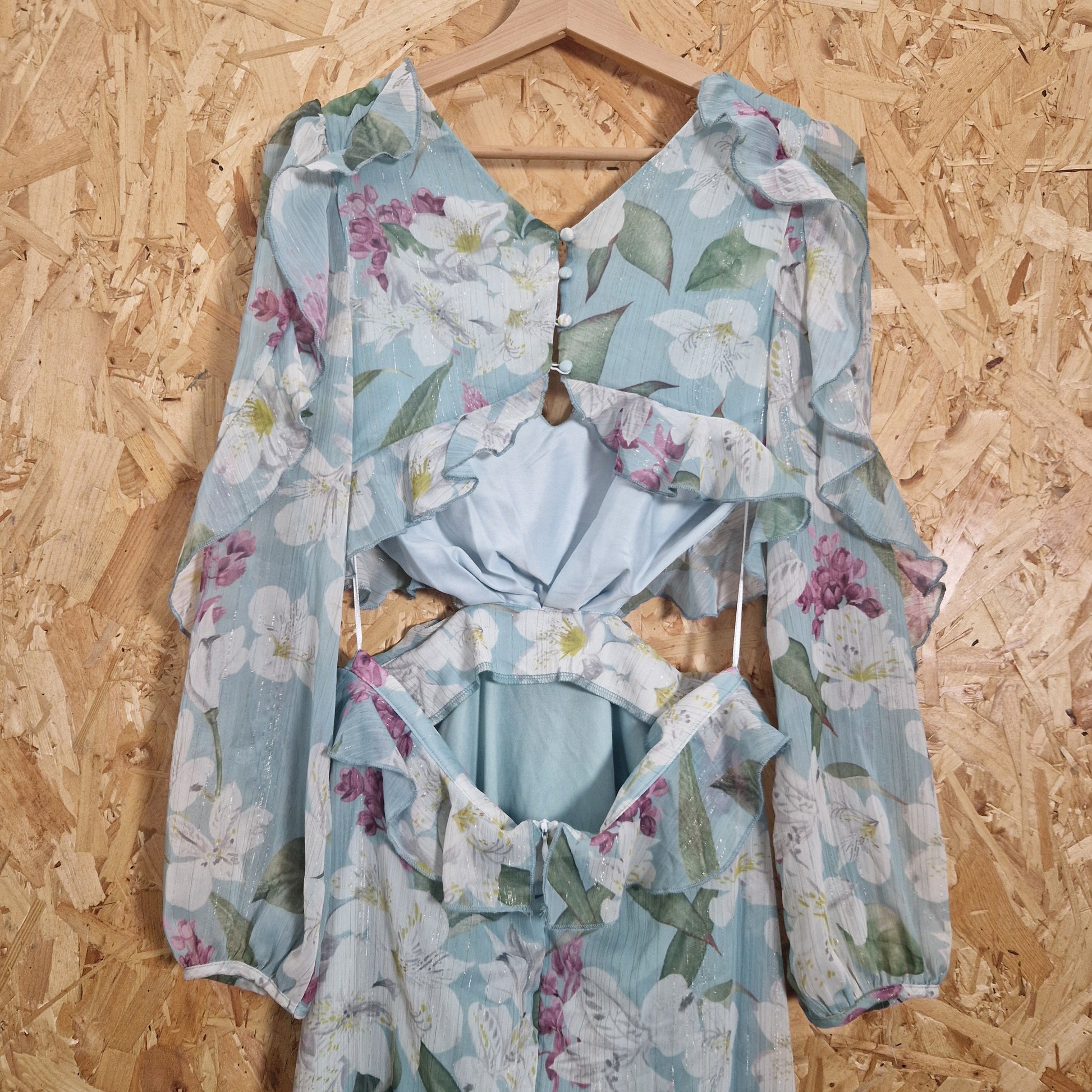 This Lipsy size 12 dress features a lightweight chiffon fabric adorned with a subtle print, delivering both elegance and comfort. The V-neckline accentuates the décolletage, while the strategically placed cut-out detail adds modern sophistication and visual interest. Fully lined. Side zip.