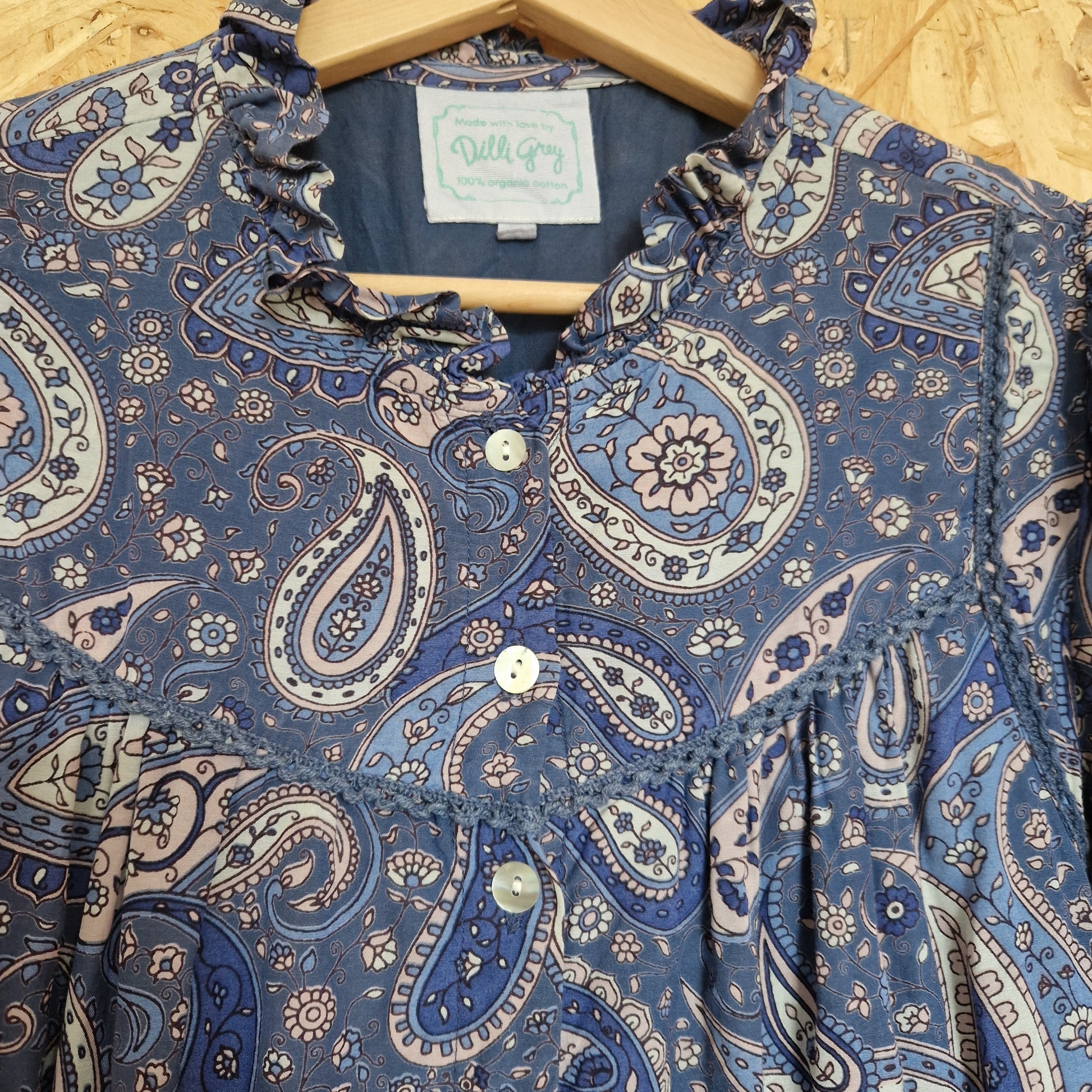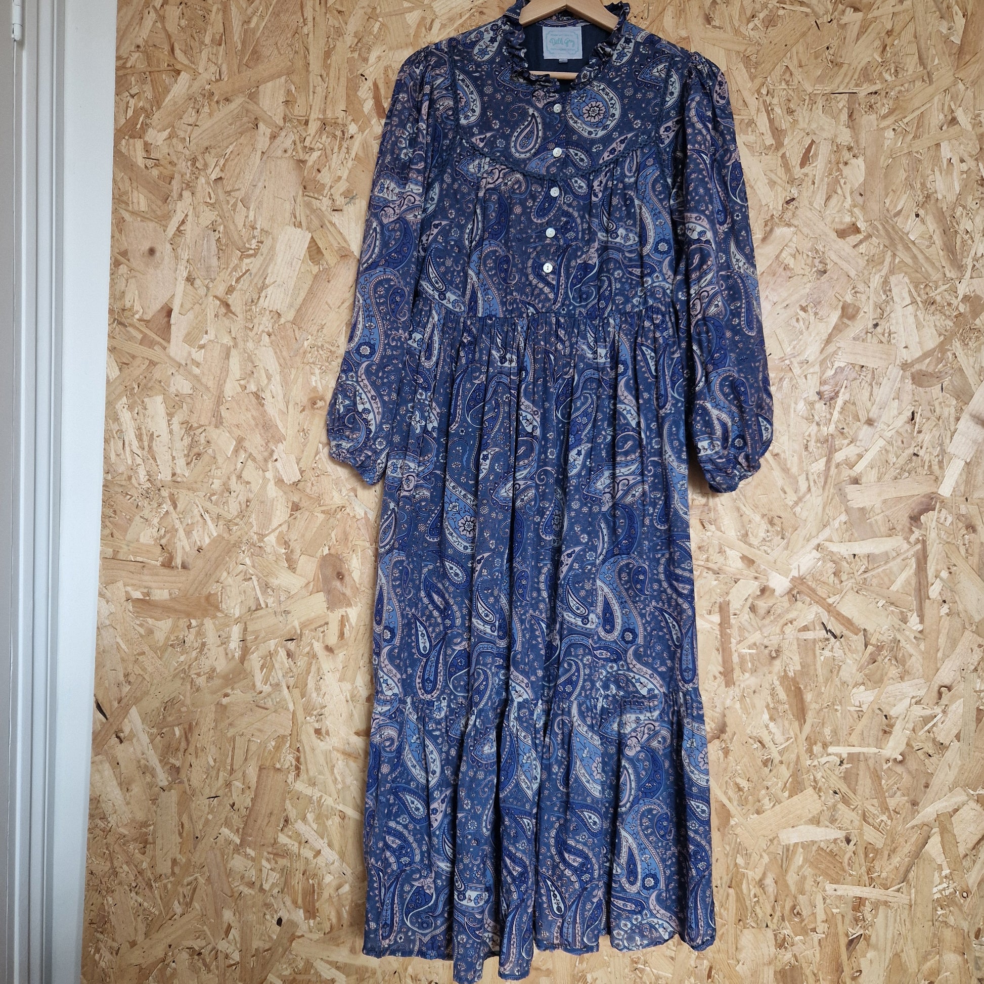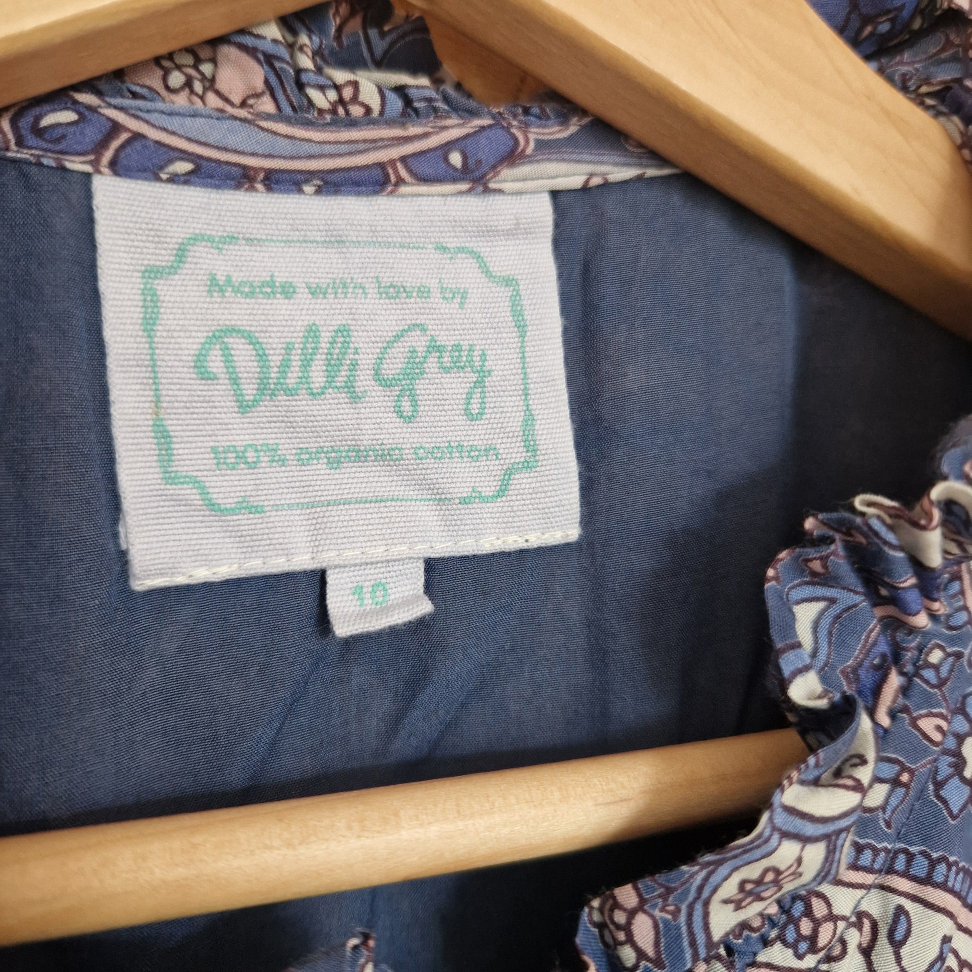 Preloved Dilli Grey Printed Dress with Frill Neck Edge & Lace Trim Size 10